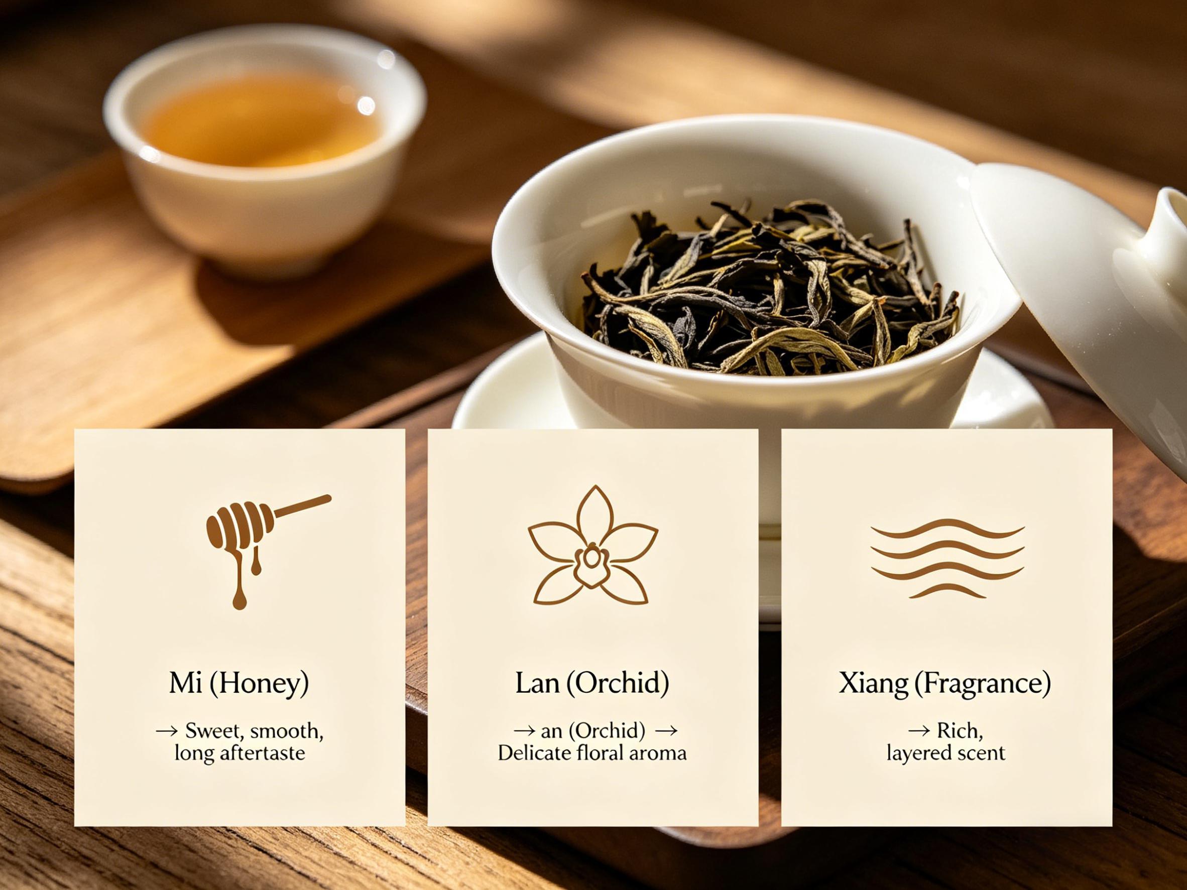 - Mi (蜜) :The tea soup has a sweet and mellow taste, a long-lasting aftertaste, and a smooth, honey-like texture.
