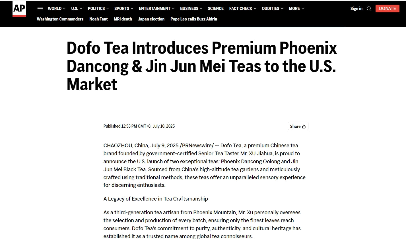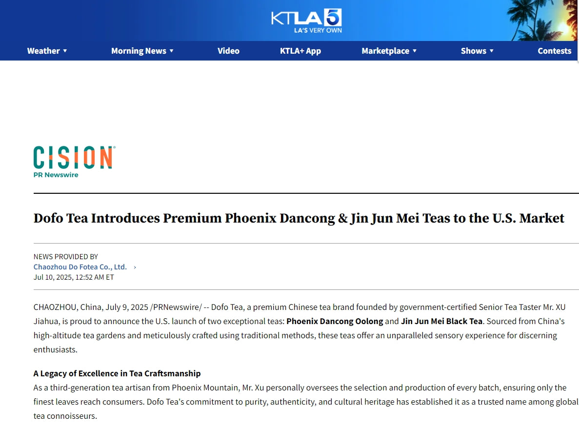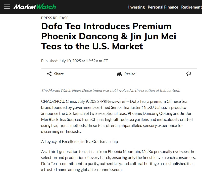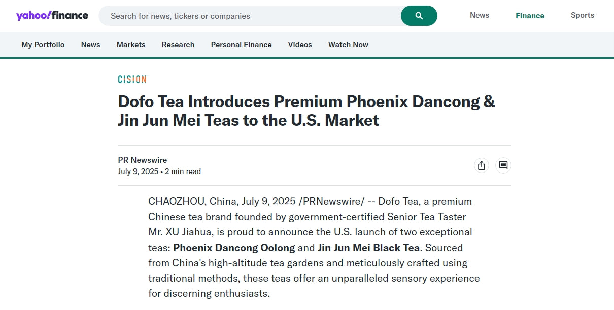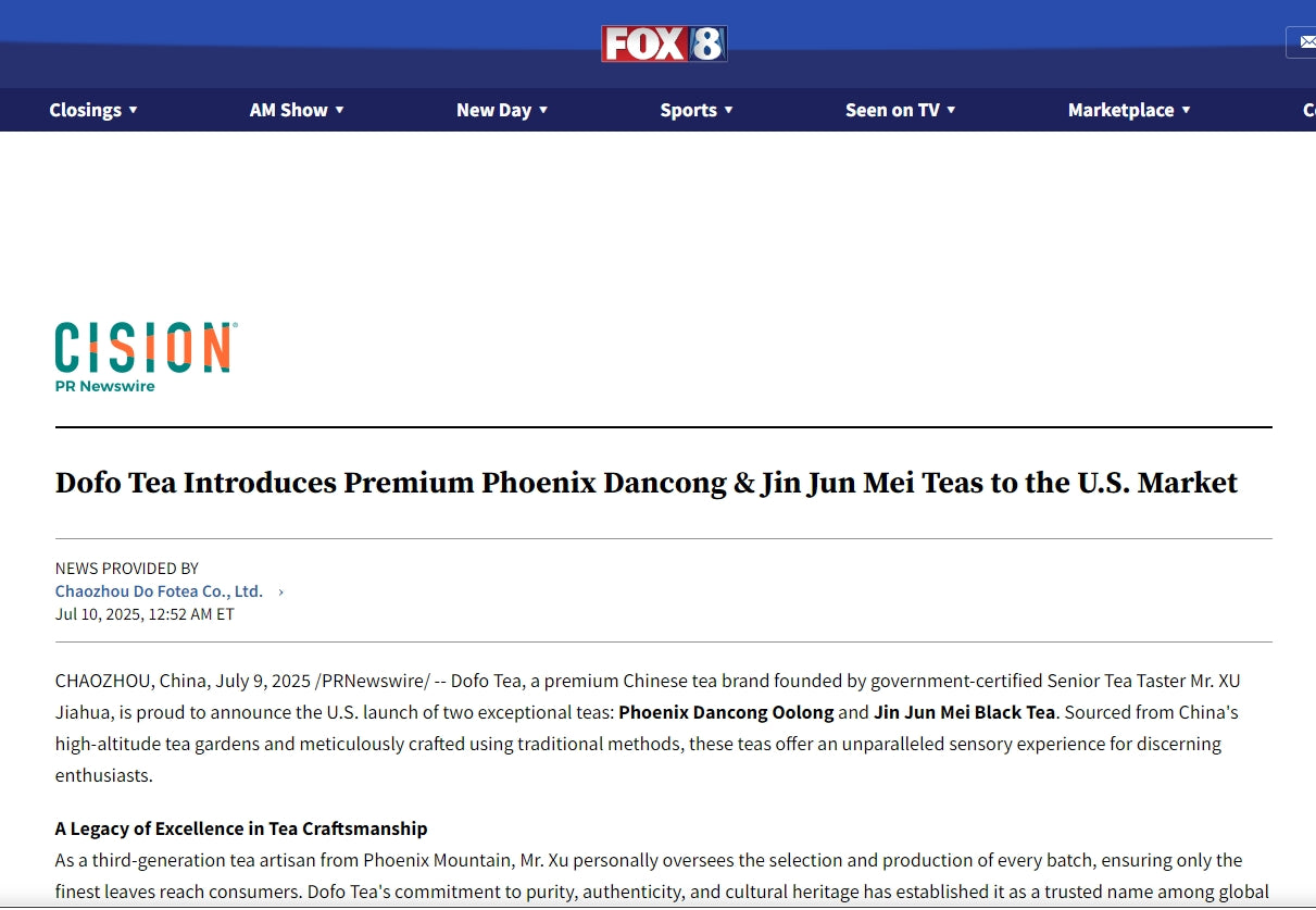 Exciting news from Dofo Tea! We’re honored to be featured by multiple well-known media outlets including Yahoo! Finance, AP News, MarketWatch, KTLA 5, Seeking Alpha, FOX 8, Benzinga, PR Newswire and more.It’s a proud moment for our team and a big step in sharing high-quality Chinese tea with more people around the world. From oolong, green tea, and black tea to white tea, Pu-erh, yellow tea, and floral blends — every leaf carries our passion for authenticity and taste.Thank you for supporting Dofo Tea.