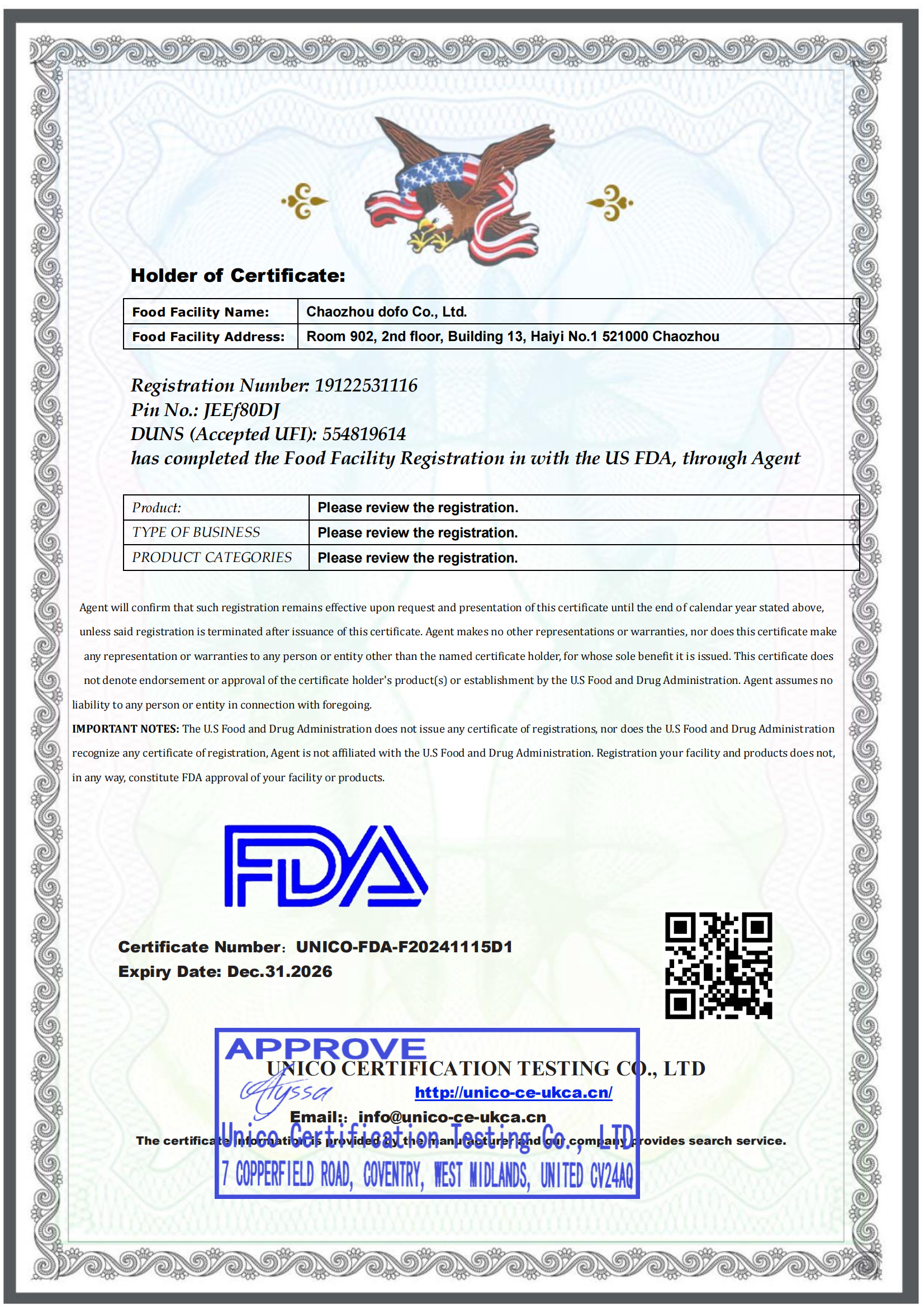 Our products are registered with the U.S. Food and Drug Administration (FDA) with registration number 19122531116. We strictly adhere to international food safety standards to ensure the safety and high quality of our tea.