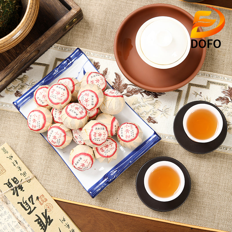 The production process of this tea first requires the use of fresh, disease-free citrus fruits, hollowing out the flesh, and leaving the peel as a container. Then put the Pu'er tea into the peel, and after careful kneading and compacting, the tea leaves and the peel are tightly combined. Finally, the Xiaoqinggan filled with tea leaves is placed in a cool and ventilated place to dry naturally until the surface of the peel presents a golden luster.